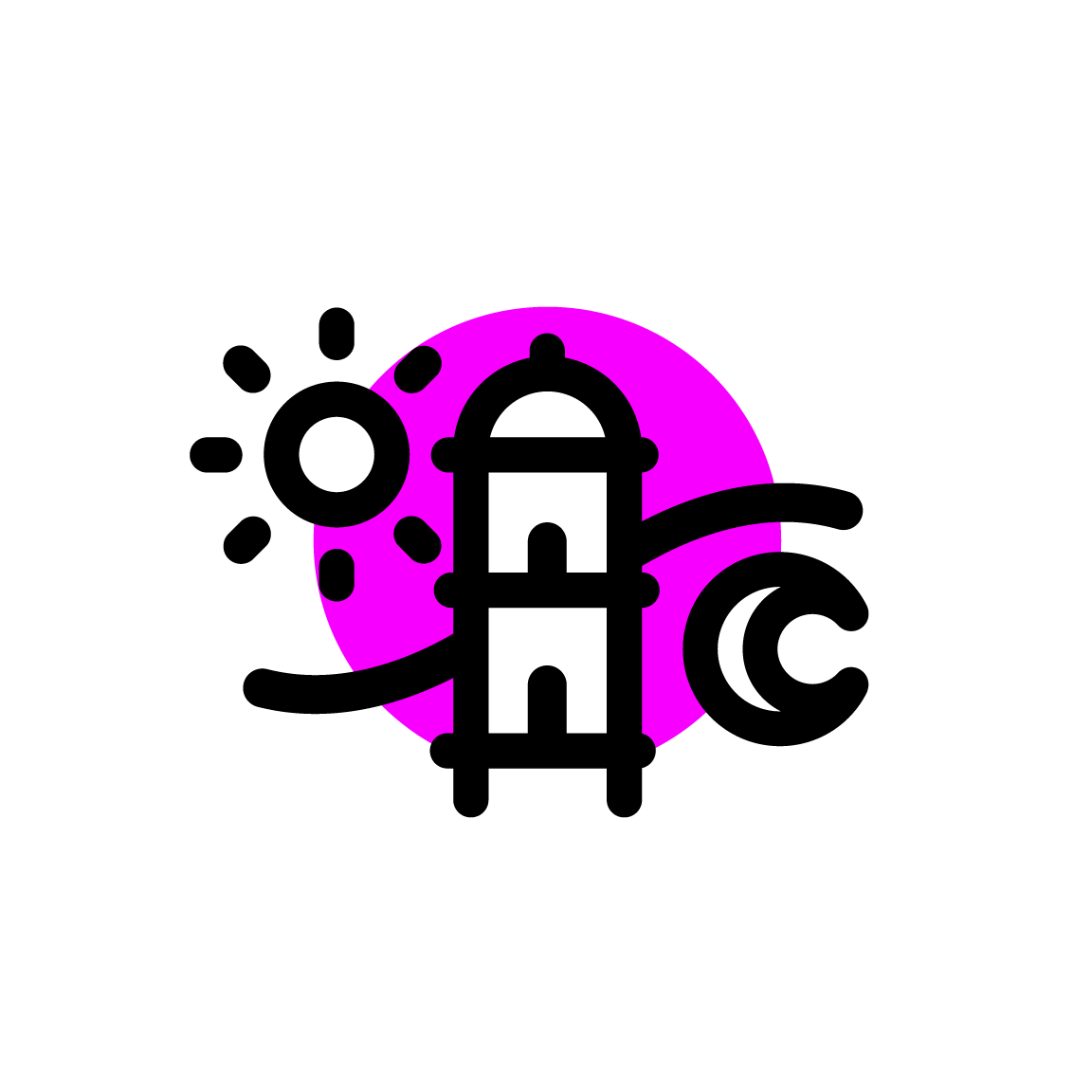 Logo I created for the Ojai Art Center. I chose the color and the placement to represent the performance spotlight and the pink moment. Strategically placed the Letters "O.A.C." within the sun, tower, and moon, creating a surprise for those who discover this hidden gem. The logo features eight sun rays, symbolizing the eight branches within the Ojai Art Center. The division of the sun and moon by a mountain or hill line not only adds visual interest but also evokes a yin-yang symbol, representing balance and unity.